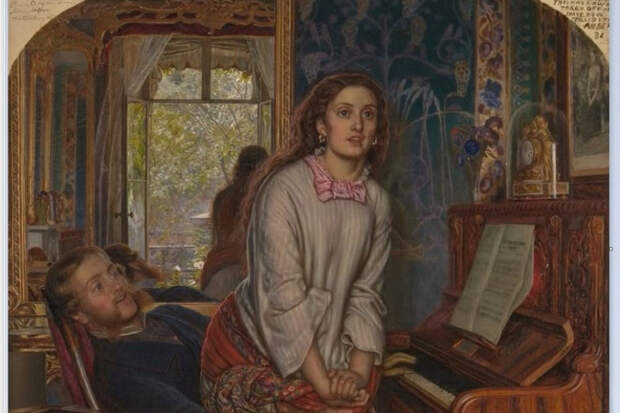 На полу в левом нижнем углу находится копия музыкальной аранжировки Эдварда Лира на поэму лорда Теннисона «Слезы, праздные слезы» 1847, в ней затрагиваются темы прошлого и утраченной любовной связи; на пианино - ноты к поэме Томаса Мура «Часто в тихой ночи», на темы памяти и счастливых дней минувших.